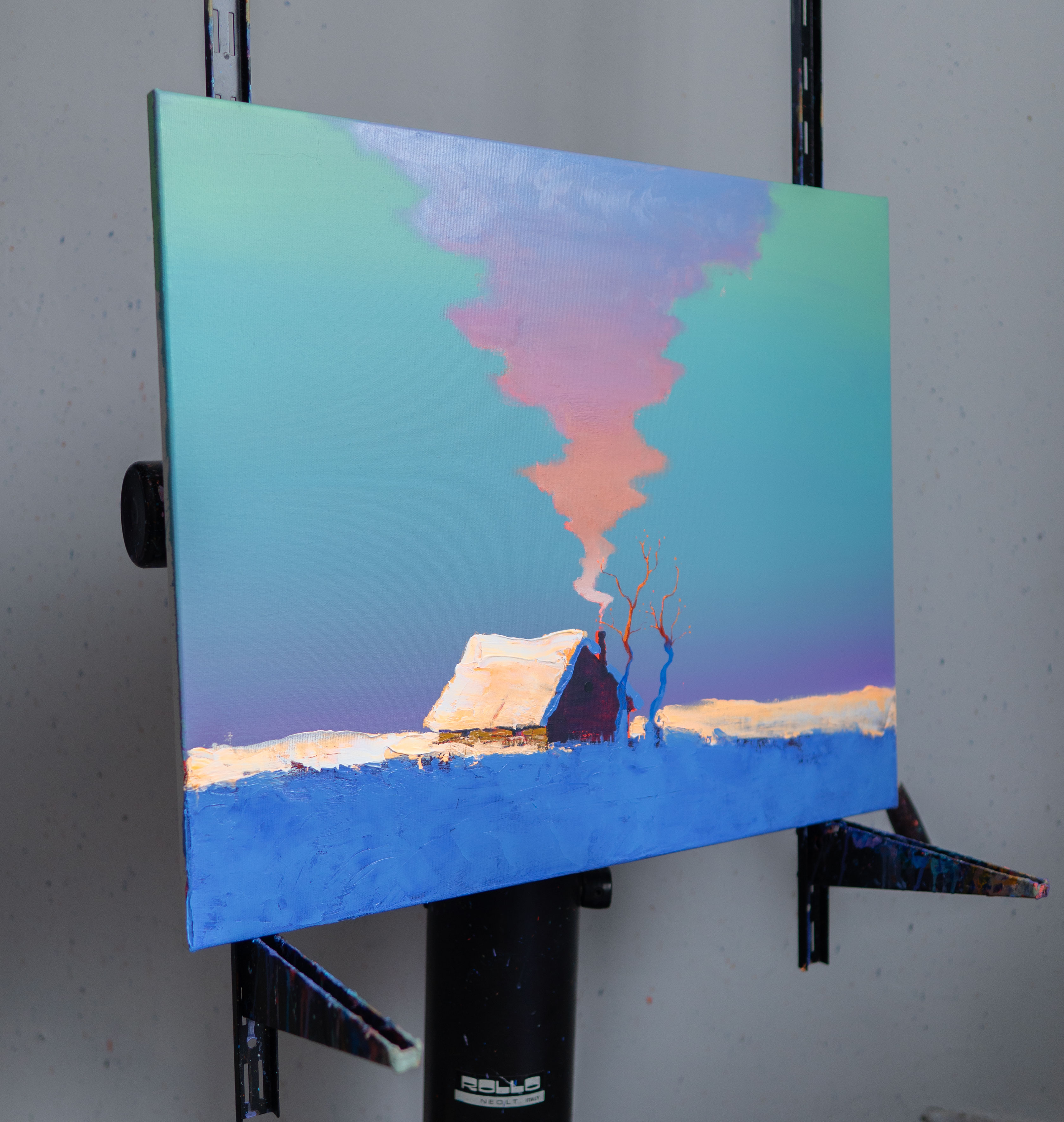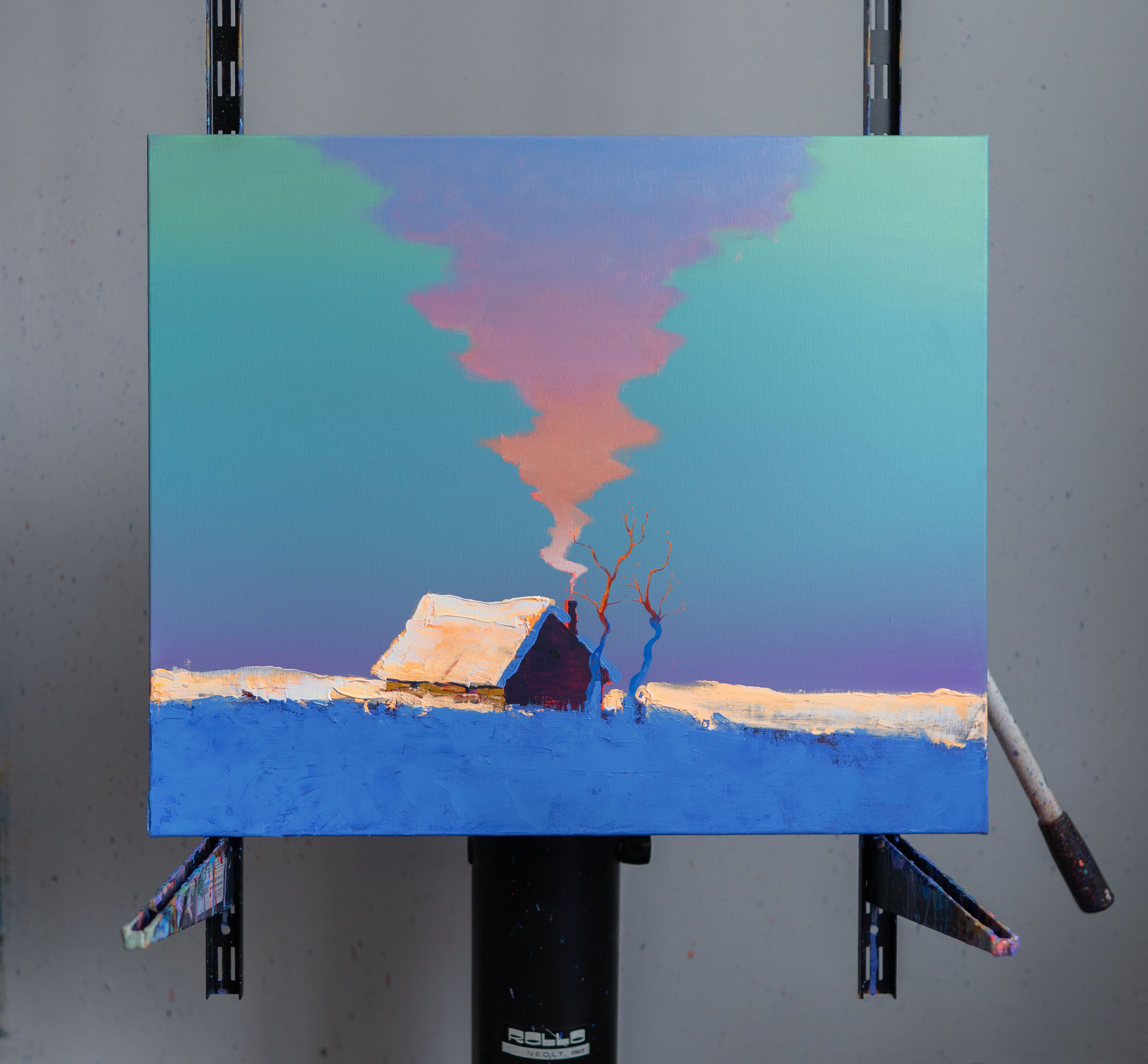 In this painting, I wanted to capture the quiet, almost fragile moment when warmth meets cold—when a soft plume of color rises into the sky from a lone house embraced by winter. As I worked, I felt the stillness of a landscape holding its breath, the gentle tension between isolation and comfort. The snow, the blue shadows, the faint hint of life within the cabin—all of it reflects my own search for a quiet place where the world slows down enough for emotions to surface. This piece is my attempt to preserve that delicate intersection between solitude and hope.