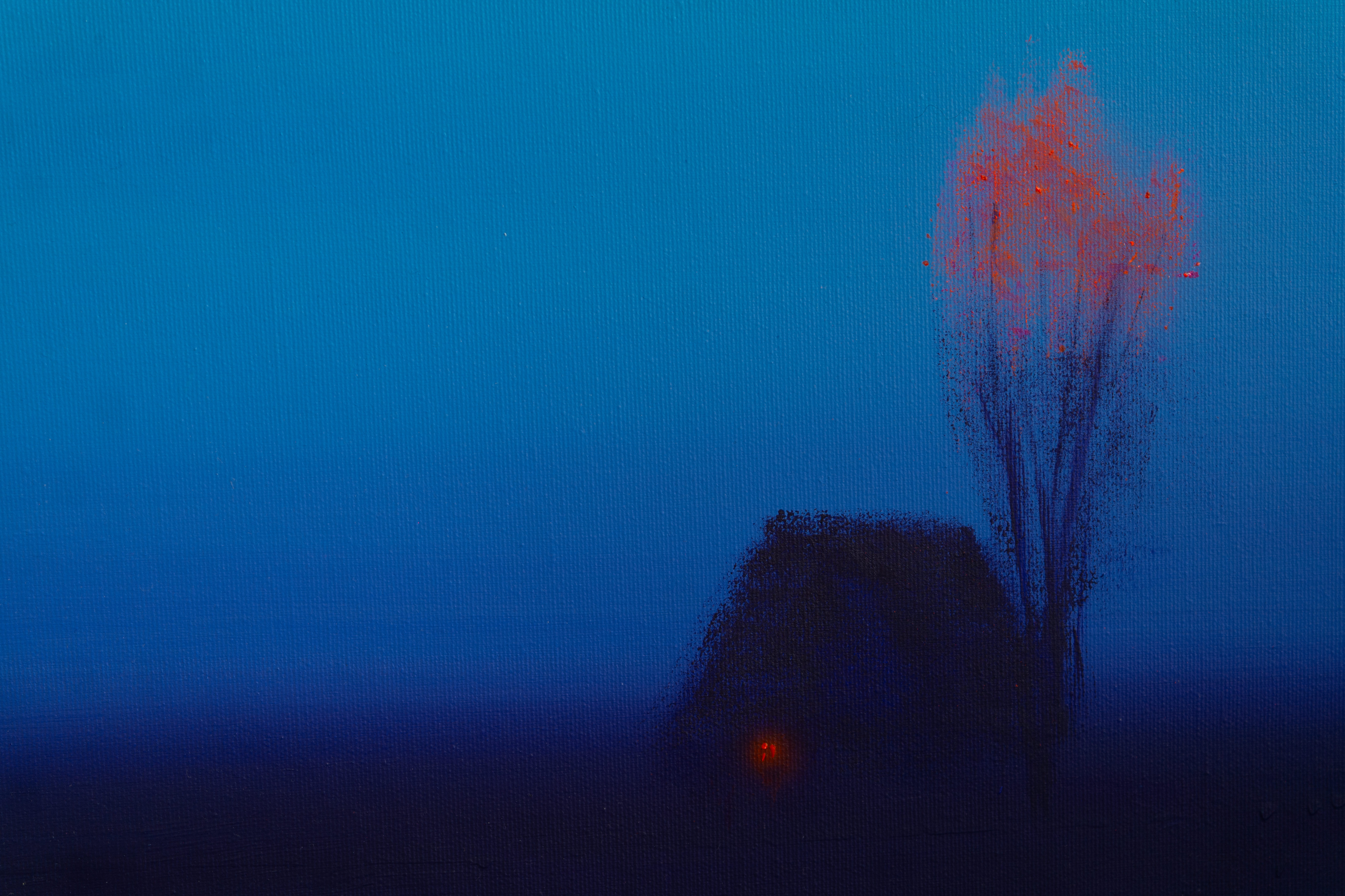 In this piece, I captured the serene magic of twilight with a minimalist touch, blending impressionism and naive styles. Using acrylic, I wanted to evoke calmness and solitude, where a single glowing window whispers warmth amidst the vast cool night.