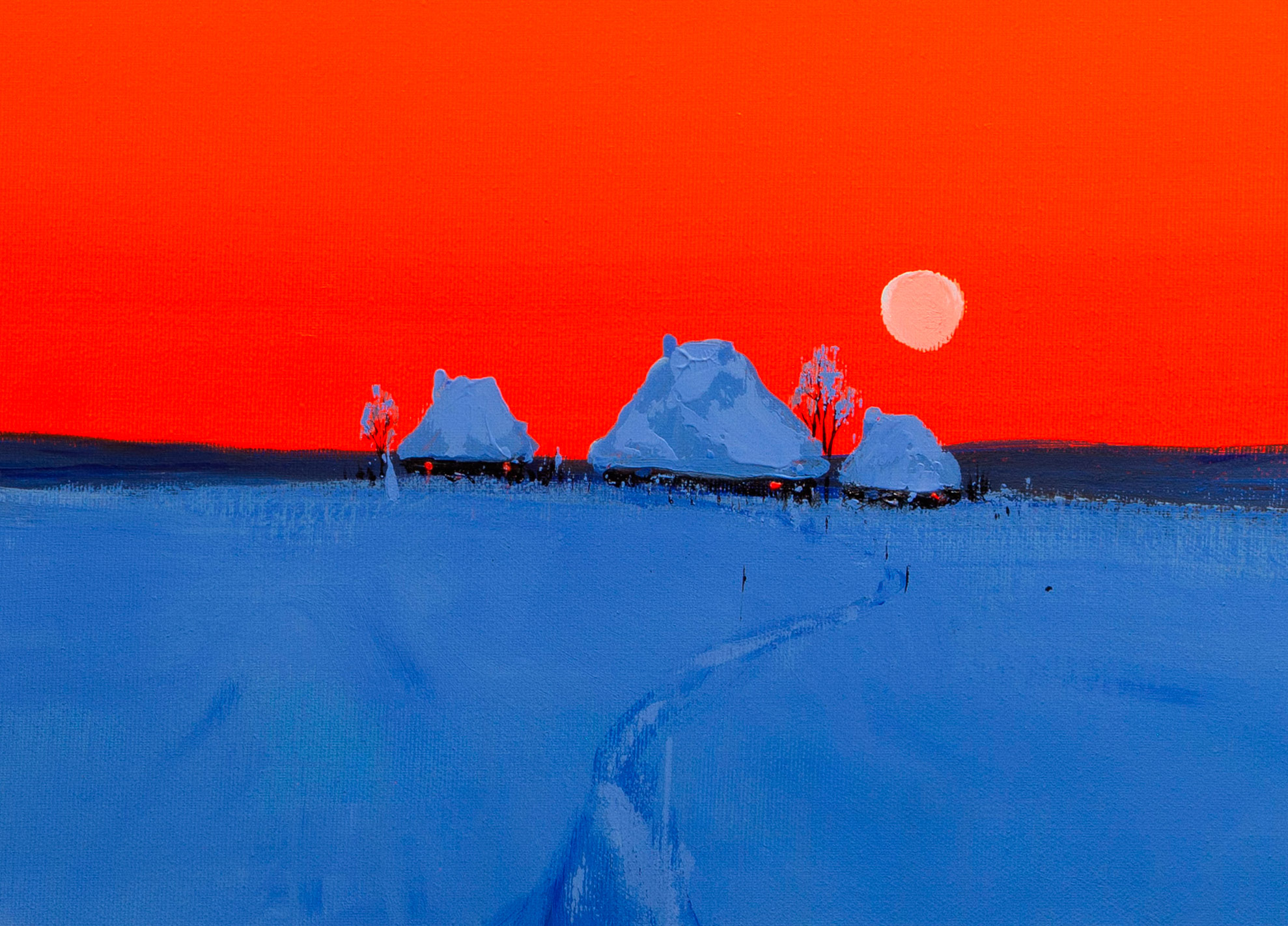 In this work, I wanted to capture that fleeting moment when the sun dips below the horizon, turning the sky into a sea of intense crimson. I was fascinated by the contrast between the "burning" sky and the absolute stillness of the frozen earth. By simplifying the shapes of the houses and the moon, I aimed to focus your attention on the raw energy of color and the feeling of vast, silent space. It is a meditation on the quiet power of nature.