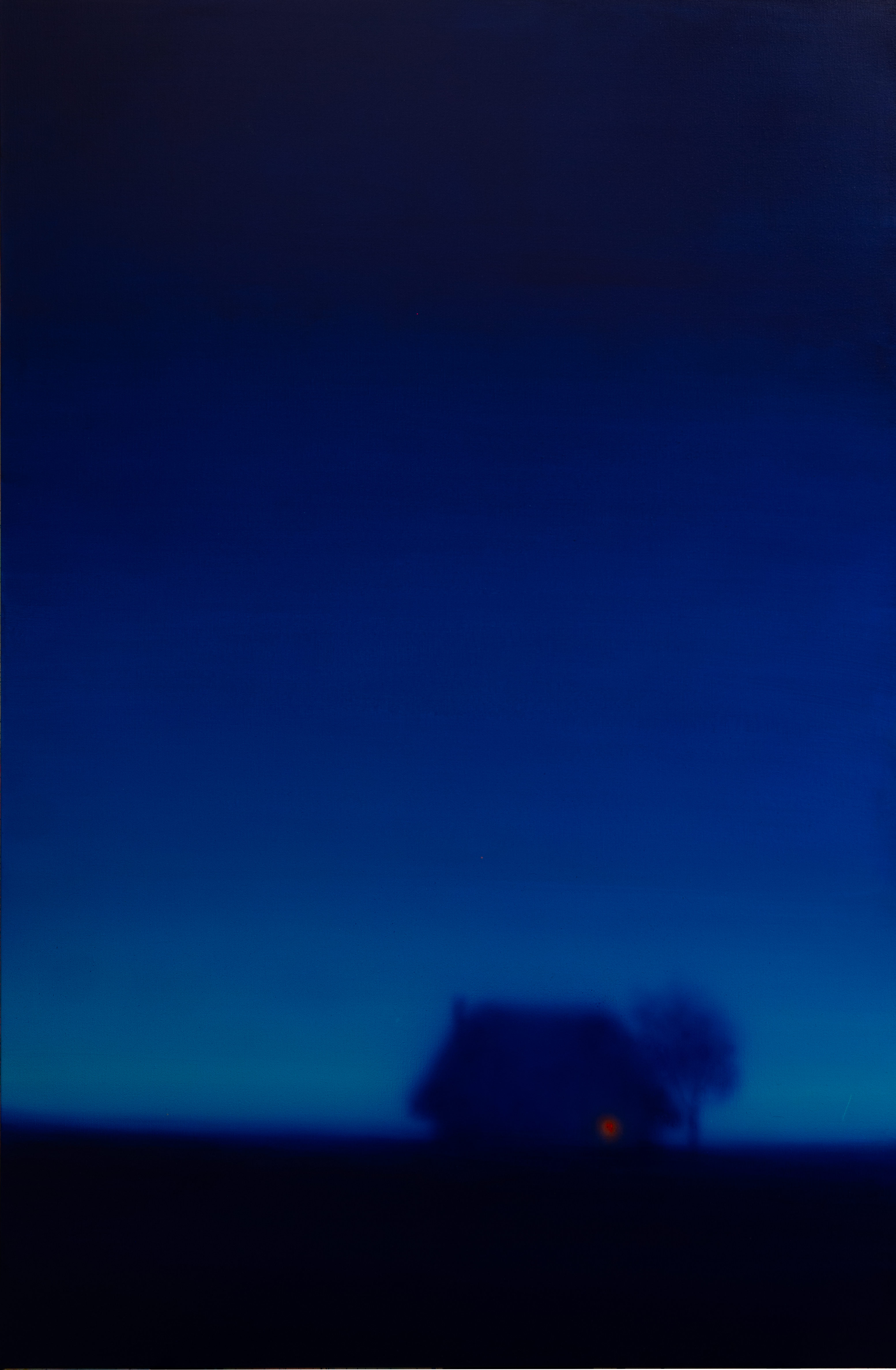 In this painting, I wanted to capture a dreamlike moment suspended between reality and imagination. The small houses seem to glow from within, their light merging with the fiery trunks of two trees reaching toward the turquoise sky. Behind them, a distant cloud rests like a silent mountain. It’s a minimal landscape about warmth and solitude