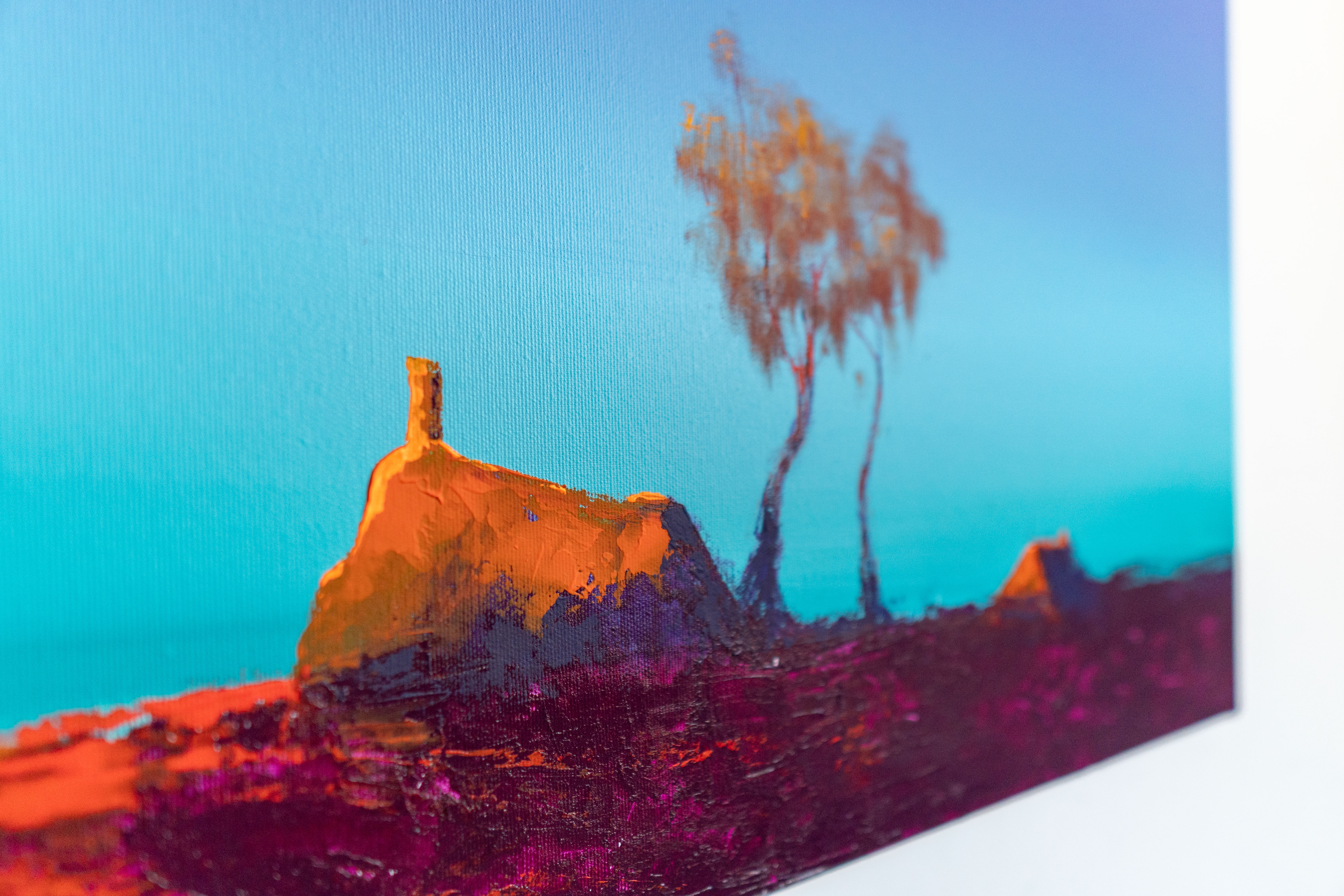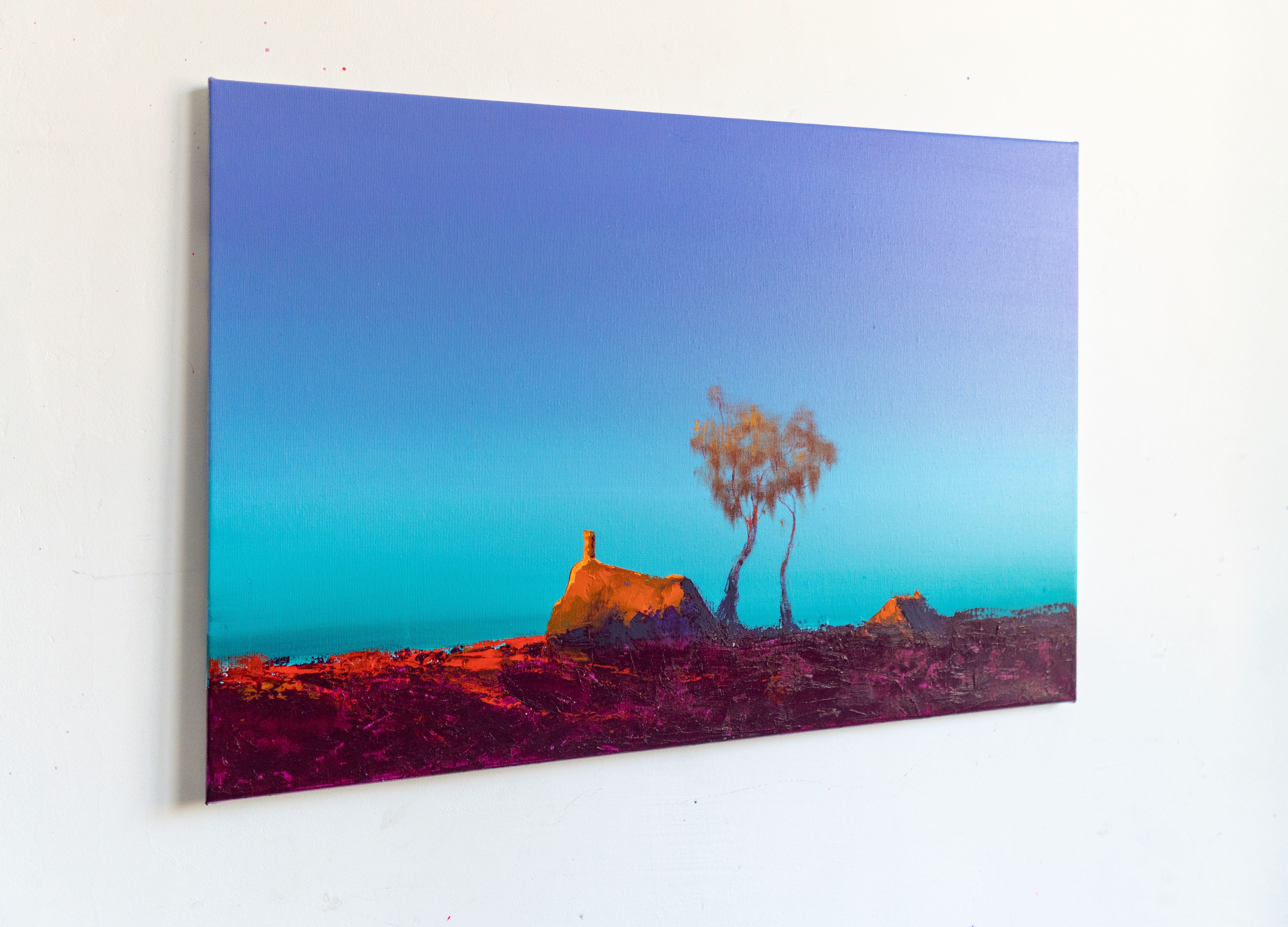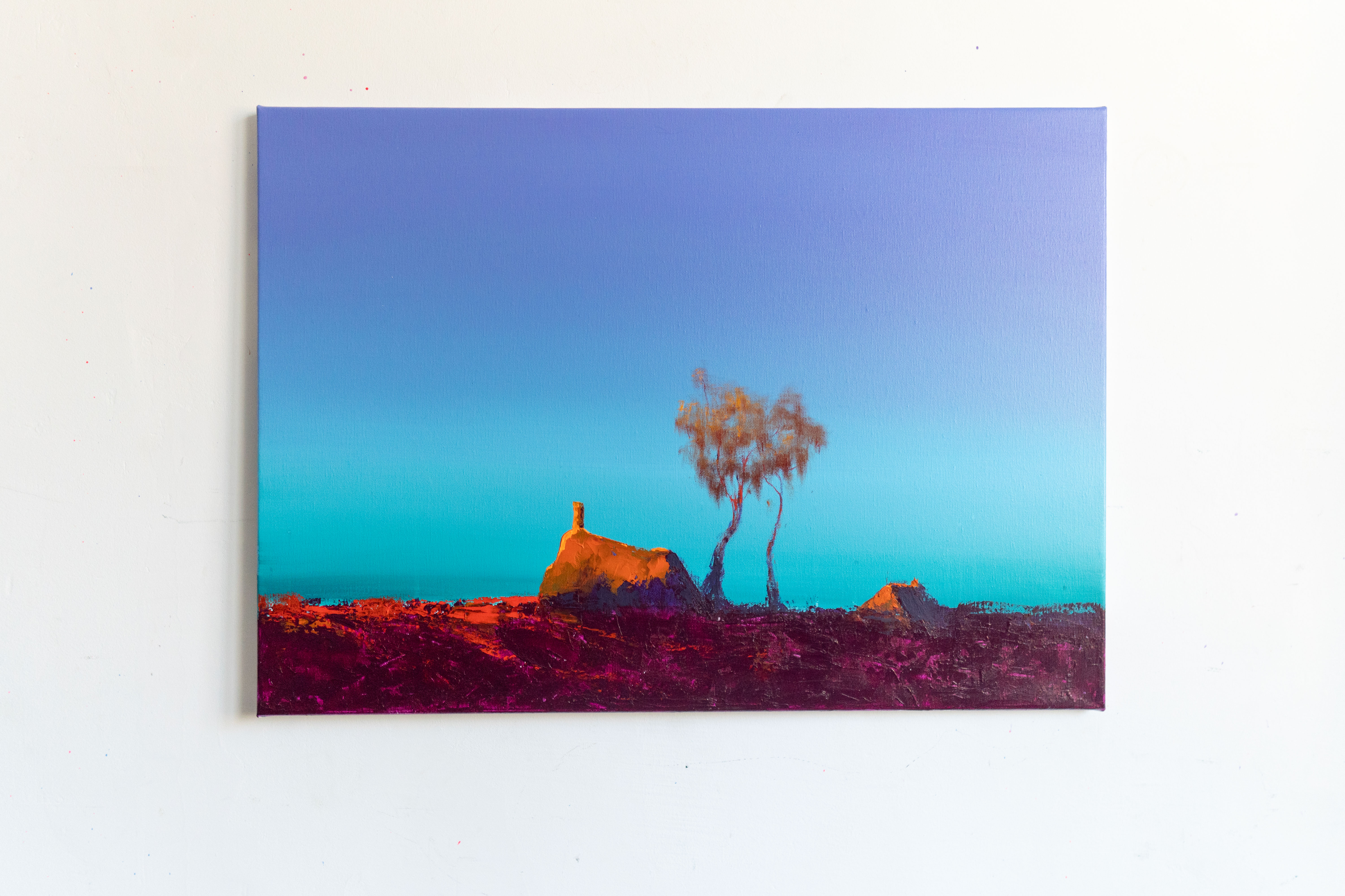 In this painting, I sought to preserve the delicate stillness that rises when the world feels both endless and intimate. The lone silhouettes and glowing colors emerged from a memory of standing beneath an expanding sky, sensing how even the quietest landscapes carry their own pulse. As I worked, I felt the horizon breathe, shifting between warmth and solitude, inviting the viewer to linger in that fragile balance between presence and distance. This piece is my attempt to hold a moment that is both fleeting and eternal, a reminder of how light transforms even the simplest shapes into something tender and alive.