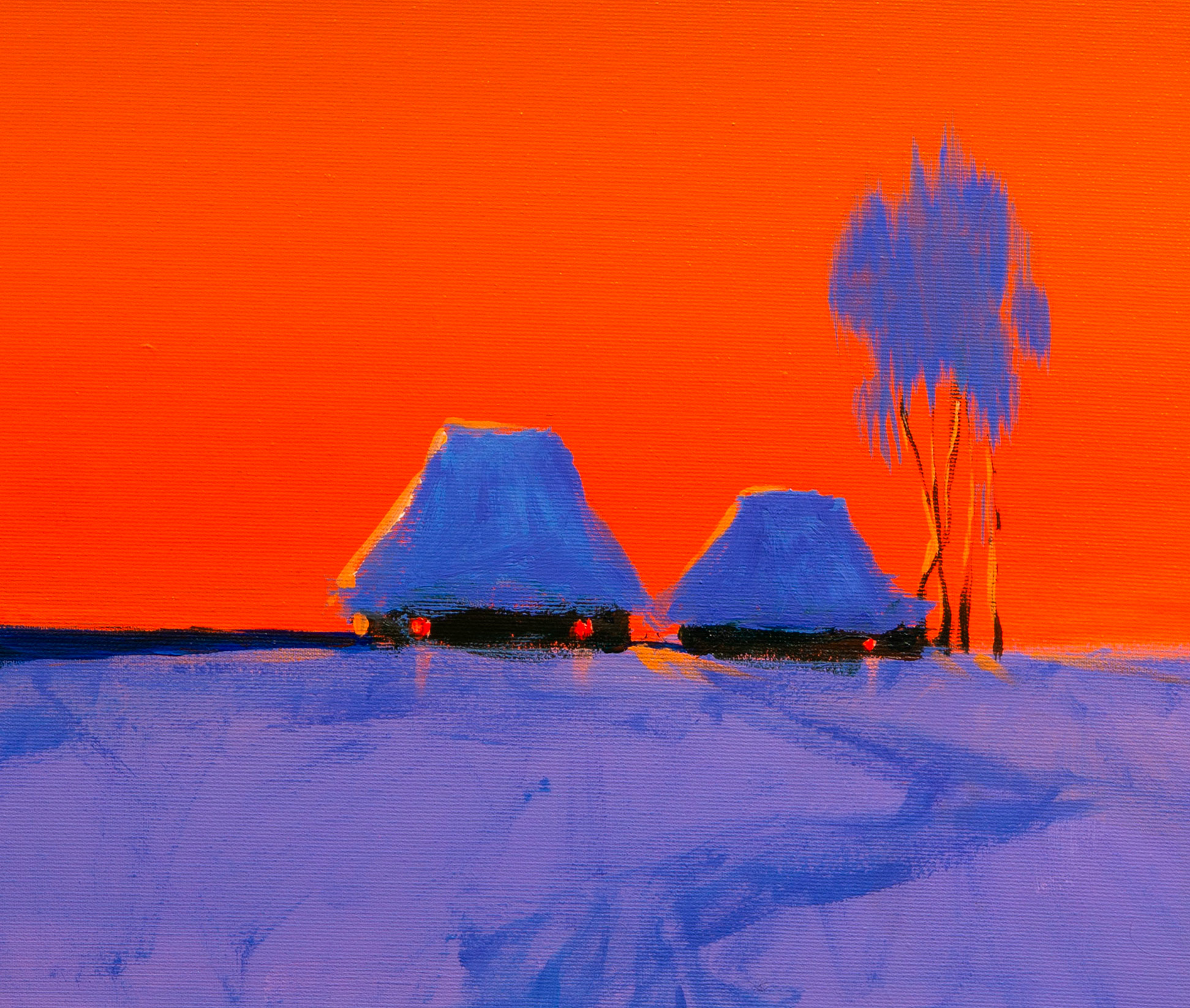 This painting is an exploration of the vibrant energy found in a winter evening. I wanted to show that winter isn't just white and grey; it’s full of hidden fire. I focused on the play of light—how the intense orange of the sky casts long, violet shadows across the textured snow.