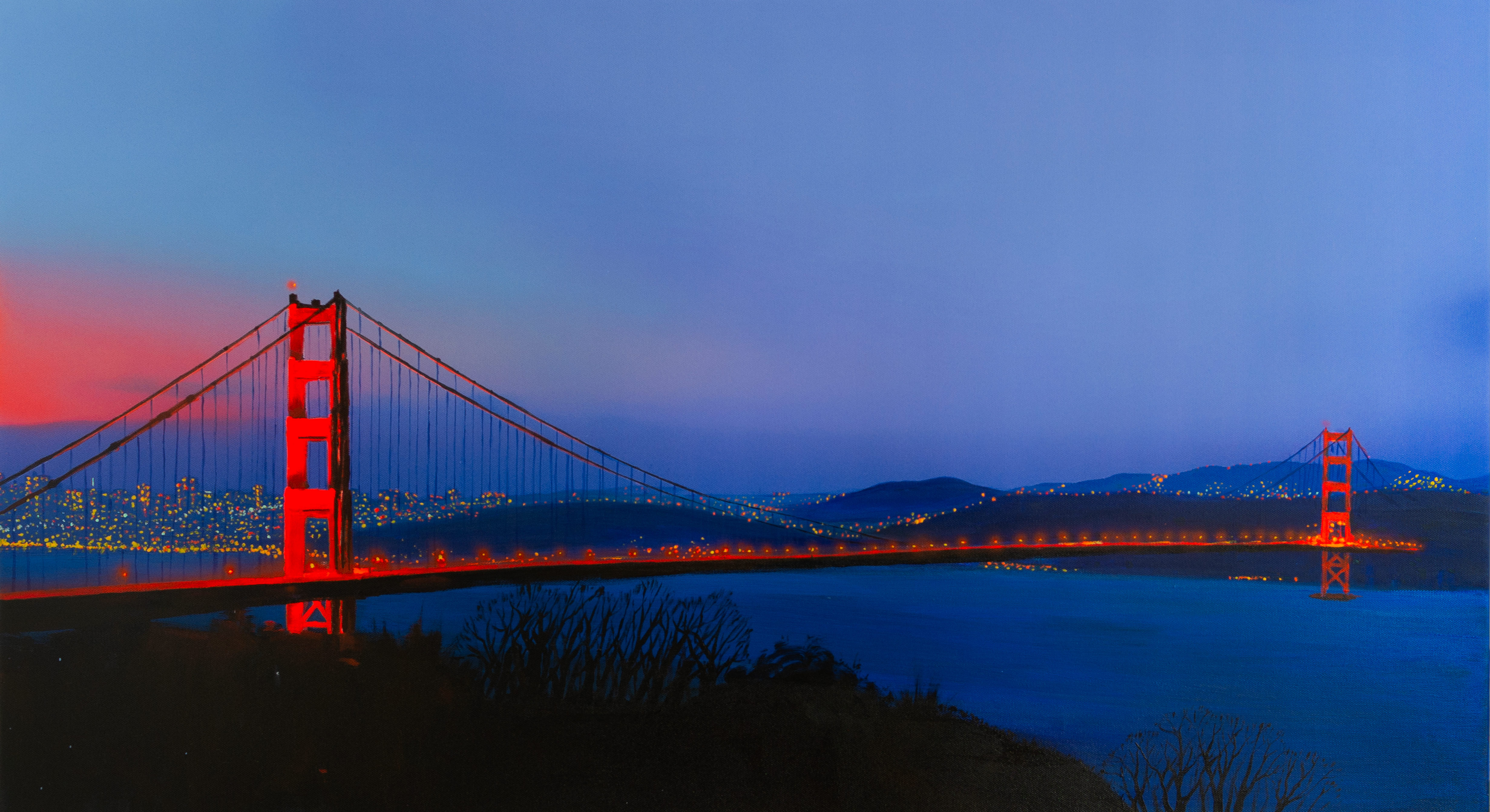 In this painting, I wanted to capture the magical moment when San Francisco begins to glow at dusk. The Golden Gate Bridge, illuminated in vivid red, becomes a radiant thread connecting the dark silhouette of the land with the endless horizon. Against the deep blue twilight sky, the bridge stands as both a symbol of strength and a delicate line of light, reflecting the heartbeat of the city.