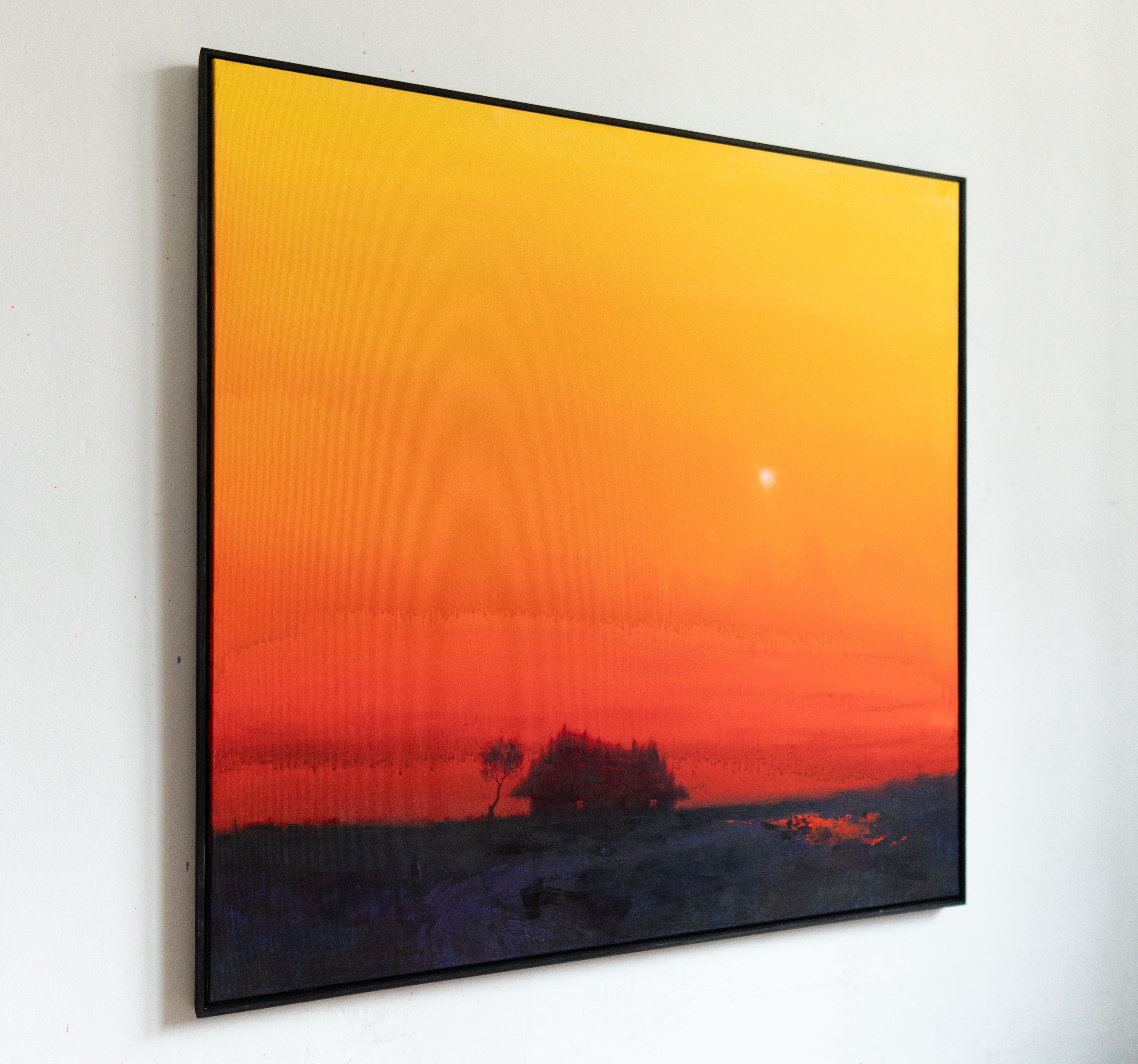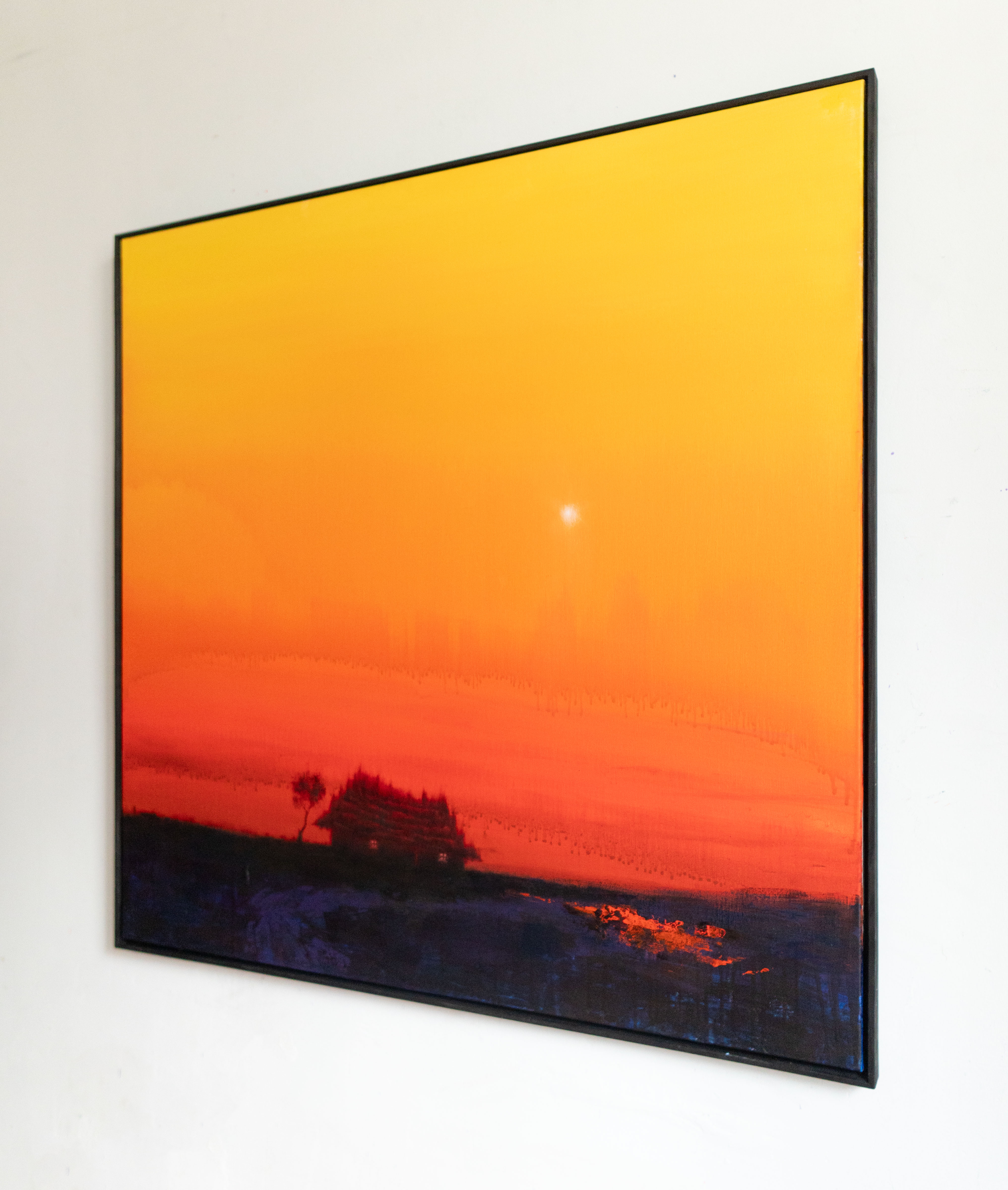 In this painting, I sought to capture the moment when daylight dissolves into a glowing ember of orange and red, leaving the world suspended between warmth and silence. As I worked, I felt the landscape breathe slowly beneath the fading sky, its dark silhouettes holding stories that only dusk can reveal. This piece is my tribute to that fragile instant when the sun’s retreat transforms the familiar into something dreamlike—when solitude feels tender rather than cold, and the horizon becomes a place of quiet promise.