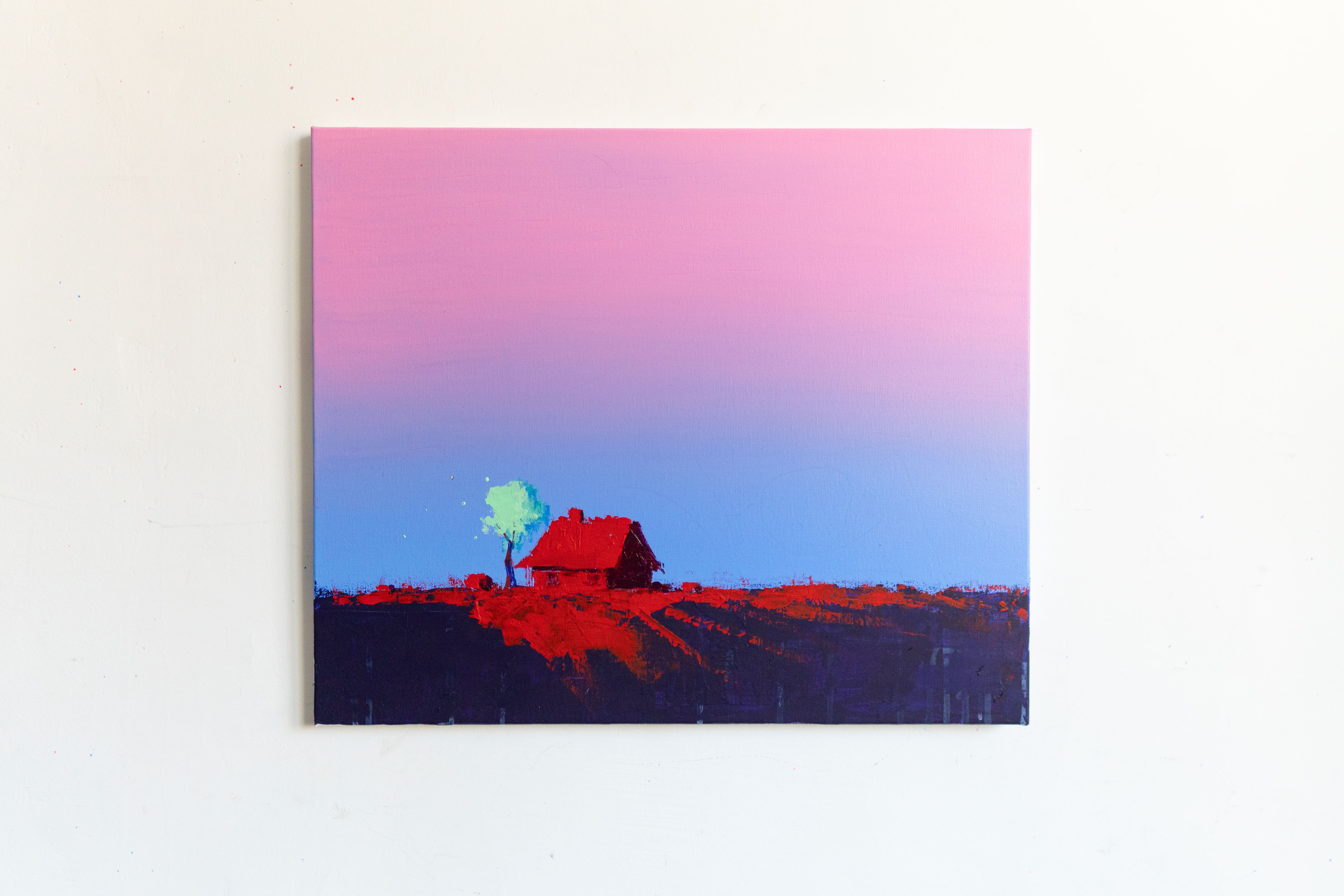 In this painting, I sought to capture the fragile stillness that lives between fading day and approaching night. The small cabin, standing alone against a vast pink–to–blue sky, reflects a sense of solitude that feels both grounding and tender. The glowing turquoise tree became a symbol of a quiet inner spark—something gentle, persistent, and unafraid to shine even in darkness. As I worked, I felt this landscape turning into a meditation on silence, resilience, and the beauty of being alone without feeling lonely. Every brushstroke carries that calm moment when the world slows, color deepens, and you are finally able to hear your own breath.