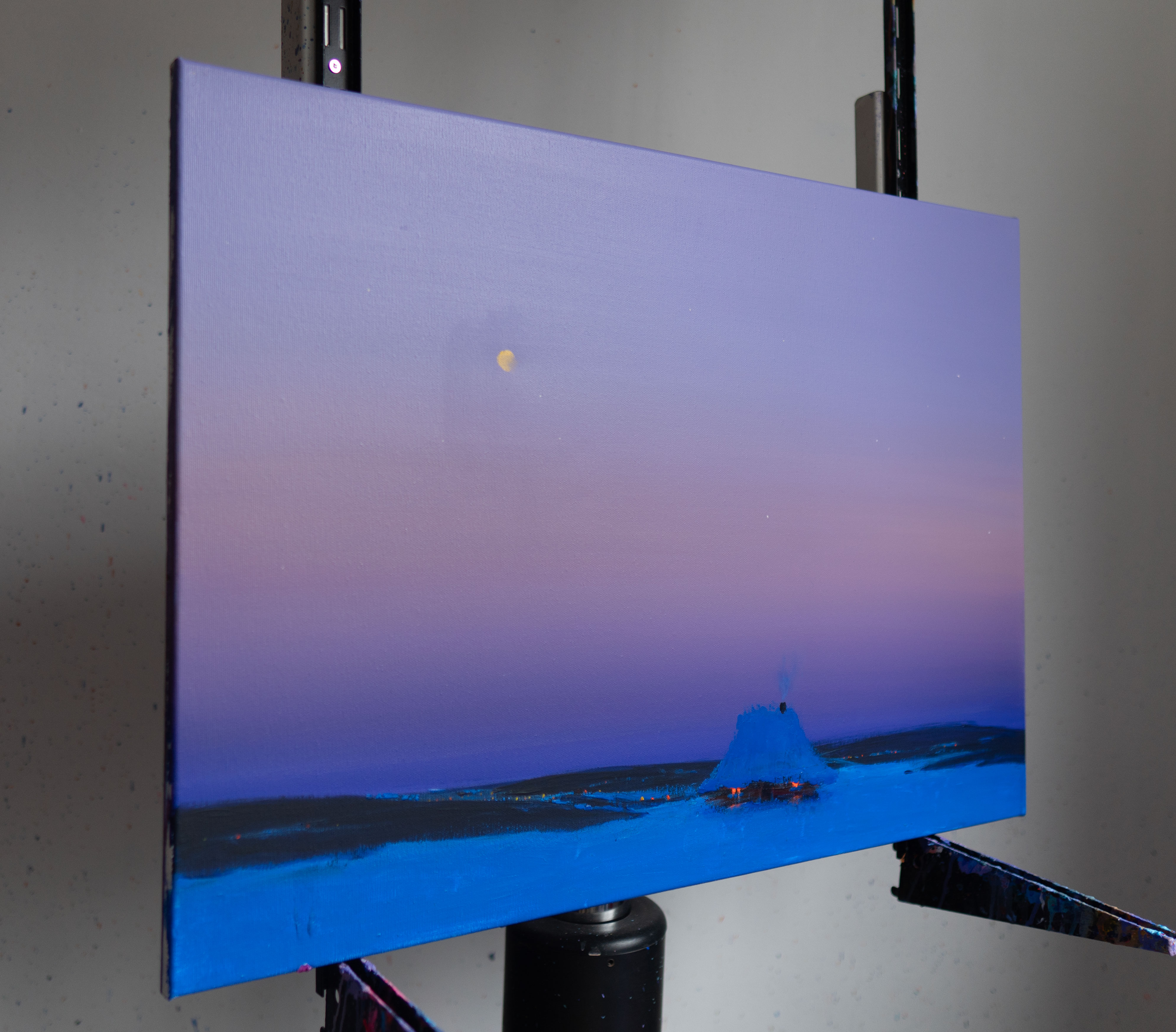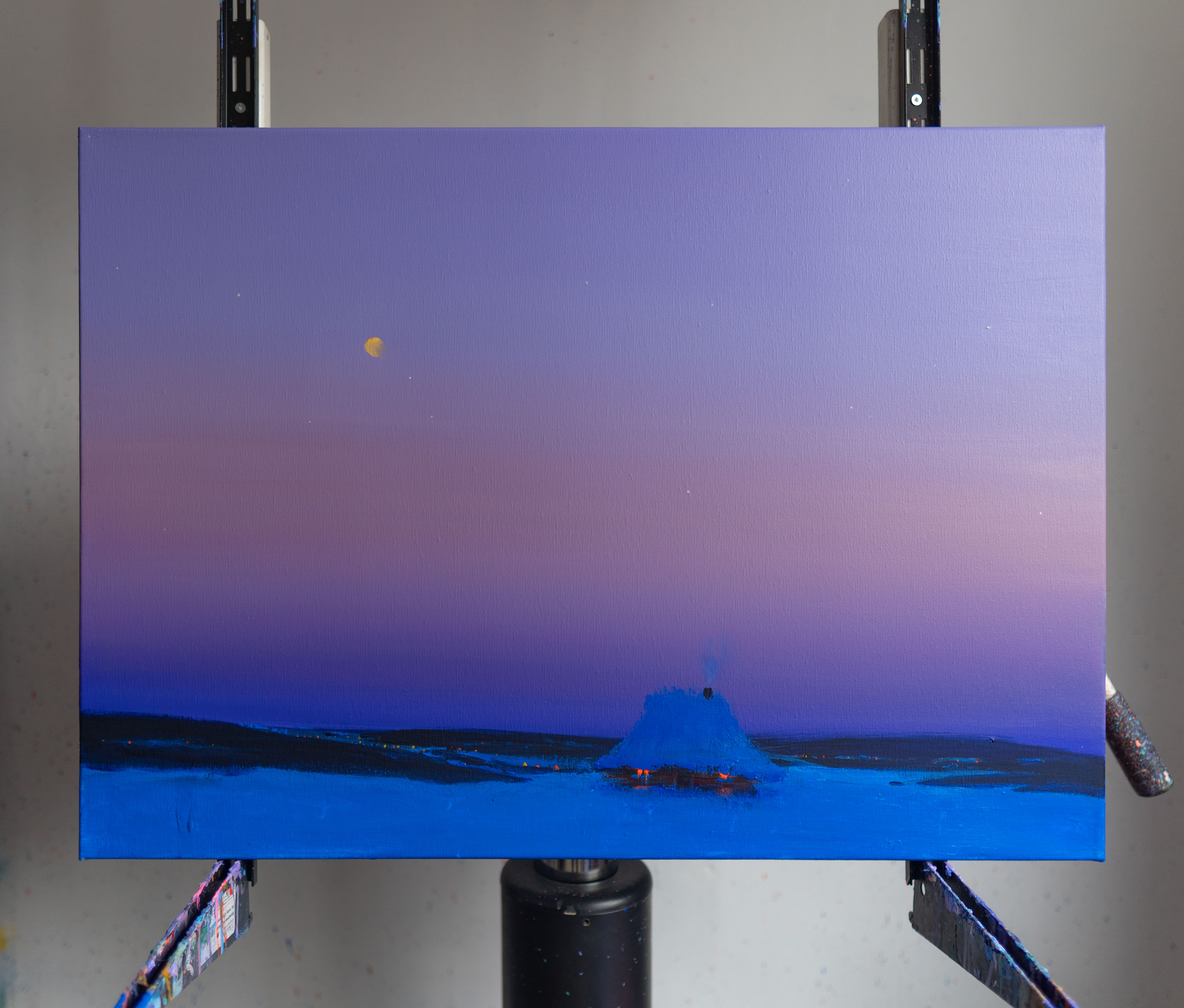 In this painting, I wanted to capture the delicate stillness that settles over a winter landscape at dusk. The fading violet sky, touched by a rising moon, creates a moment where time seems to pause. I painted the small snow-covered shelter as a symbol of warmth held against the vastness of night. For me, this scene reflects both solitude and comfort—a quiet reminder that even in the coldest landscapes, there is a gentle glow waiting to be found.