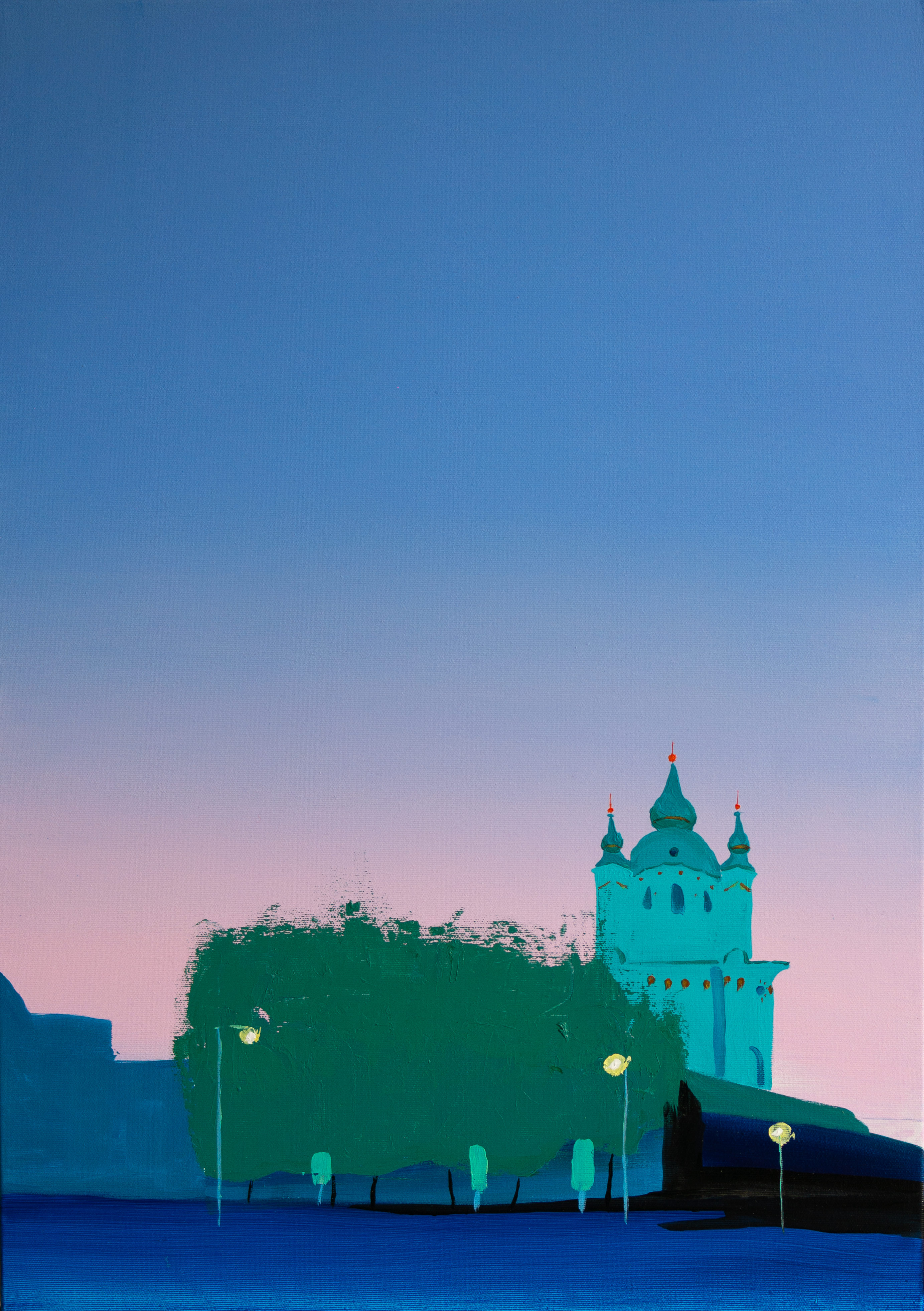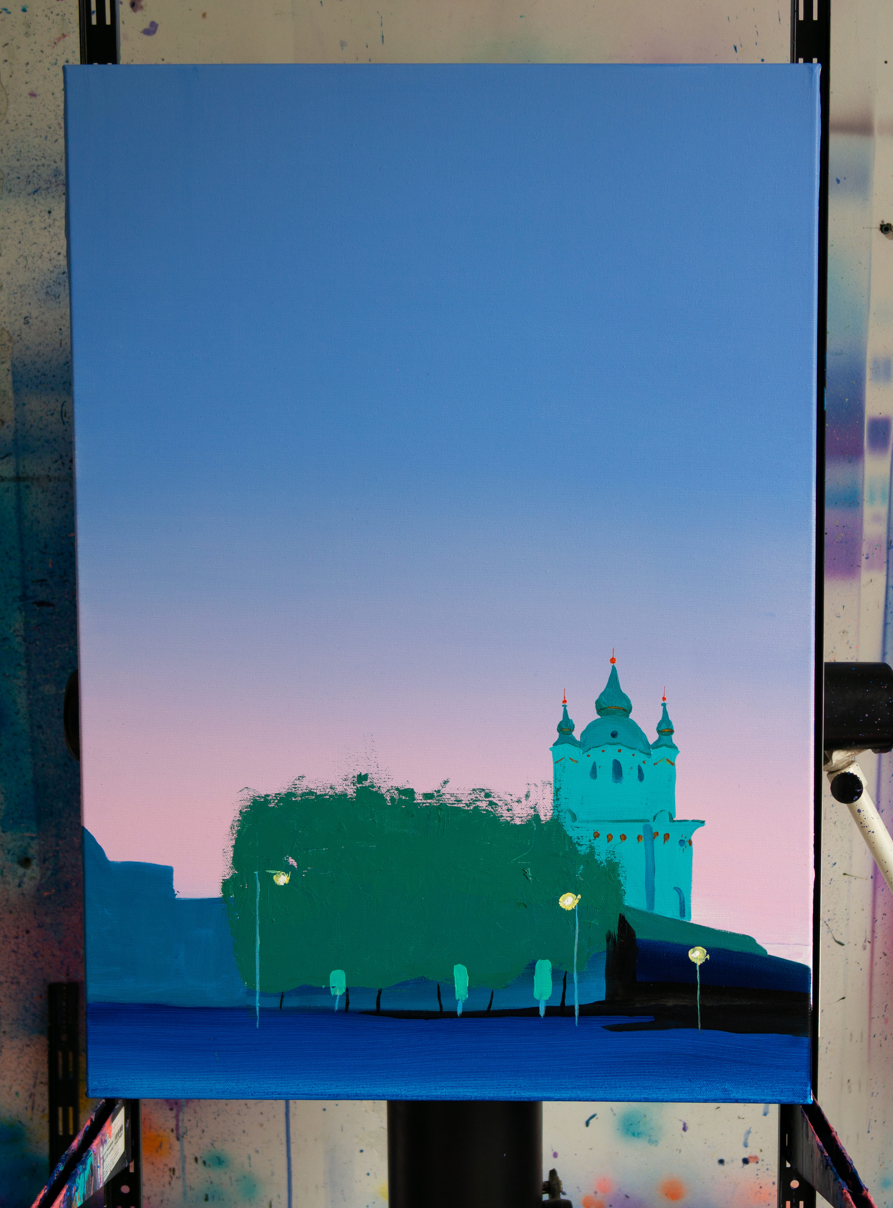 This painting captures a quiet evening moment in Kyiv, where the soft blue hour sky meets the serene silhouette of one of the city’s historic churches. I wanted to preserve that delicate transition between day and night when the air becomes cooler, the colors shift into pastel tones, and the city slows down for a brief, contemplative pause.