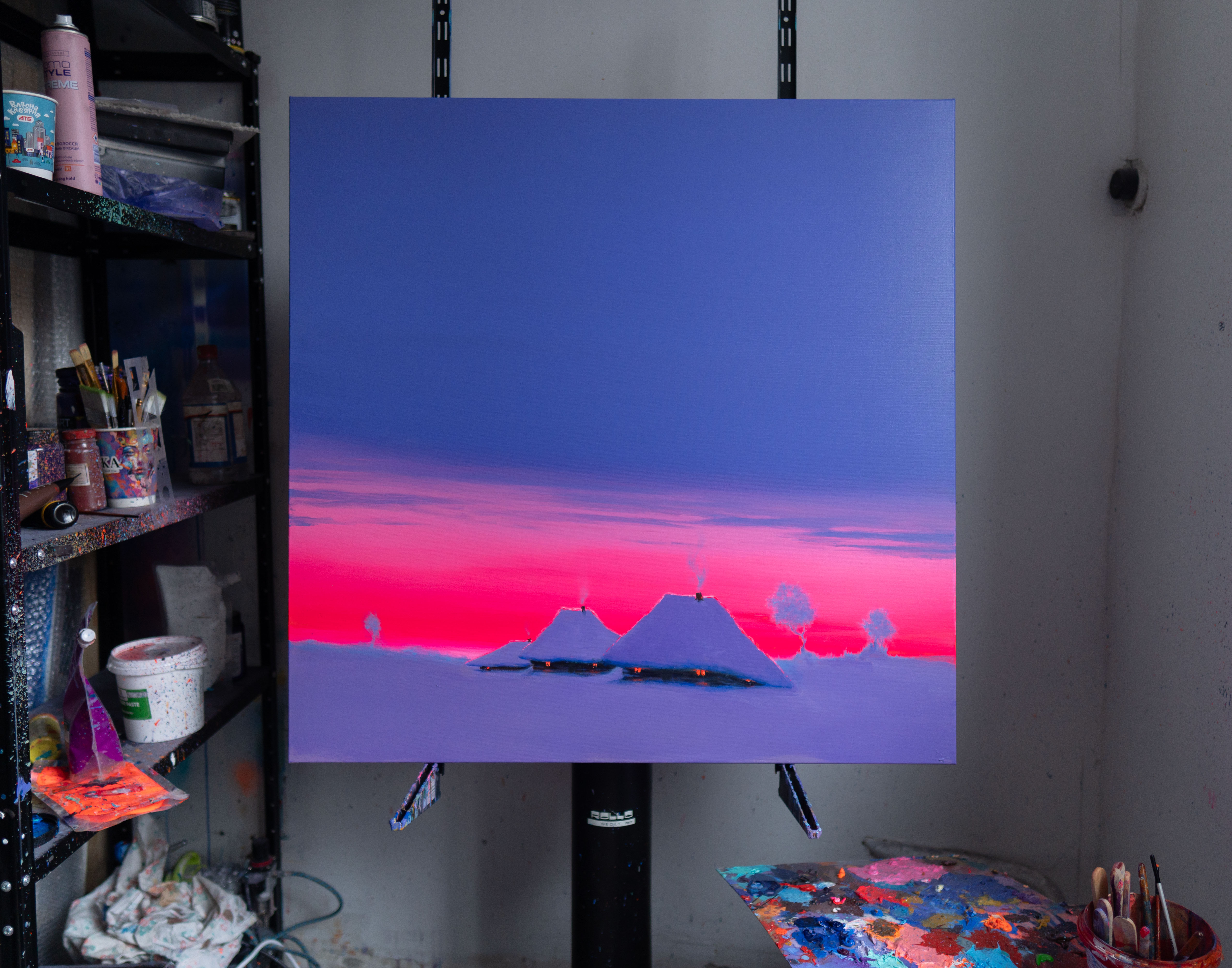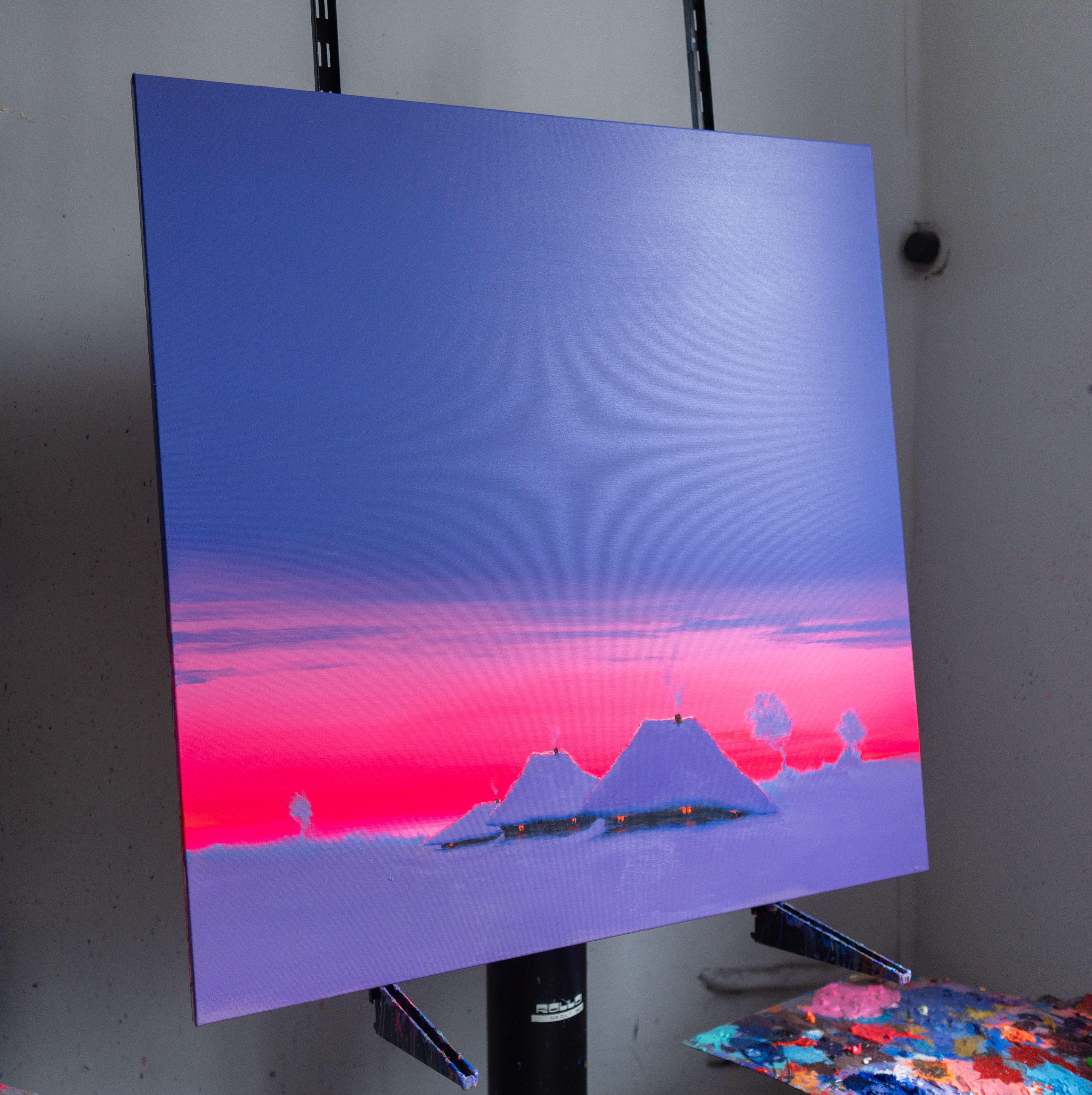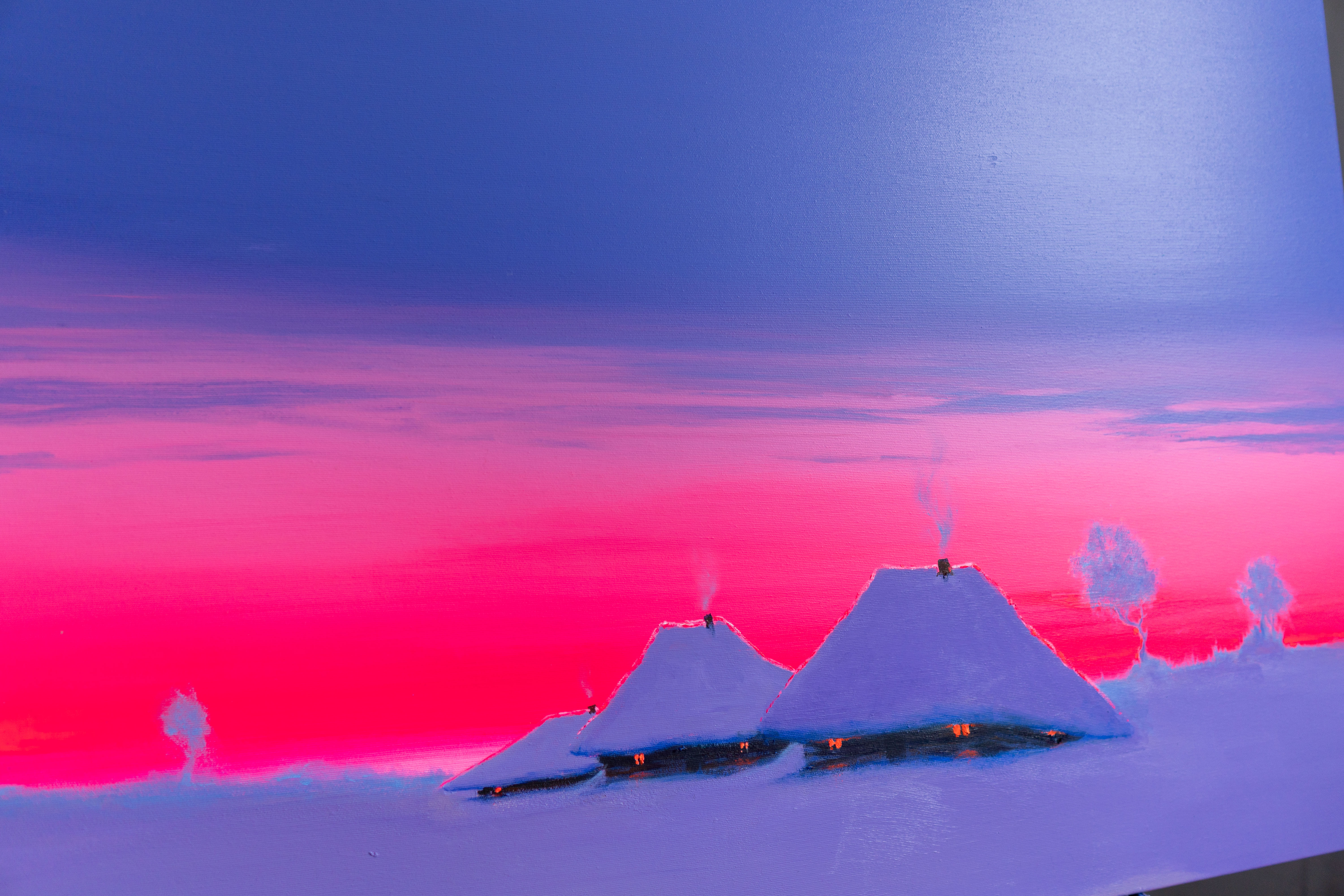 In this painting, I wanted to capture a moment when the world seems to breathe in softly and hold itself still. The two quiet rooftops resting under a vast sky became symbols of calm perseverance for me. As the deep blue melts into a warm, glowing horizon, I feel a gentle tension between cold and warmth, solitude and comfort. This contrast is where I find the poetry of winter evenings — that fragile instant when light fades but never fully disappears. I painted it to preserve that fleeting sense of shelter, silence, and hopeful glow that lingers long after the sun sinks.
