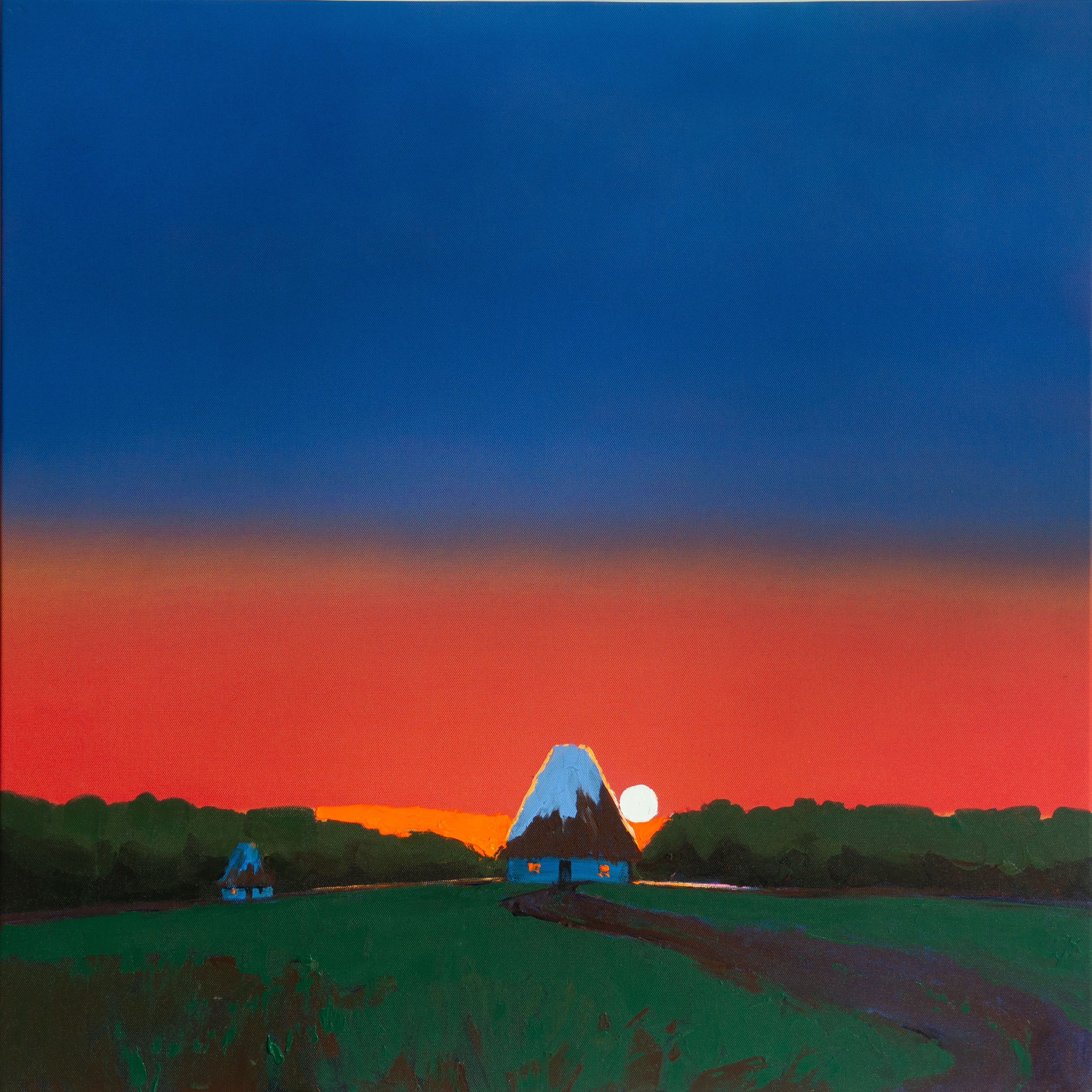 Atmospheric landscape capturing the quiet beauty of rural life at sunset. The composition features a small thatched-roof house glowing warmly against a dramatic gradient sky that shifts from fiery orange to deep indigo. A winding path draws the viewer into the scene, inviting them to imagine the peaceful life within. The bold colors and minimalist style evoke both nostalgia and serenity, making this a powerful yet calming piece.