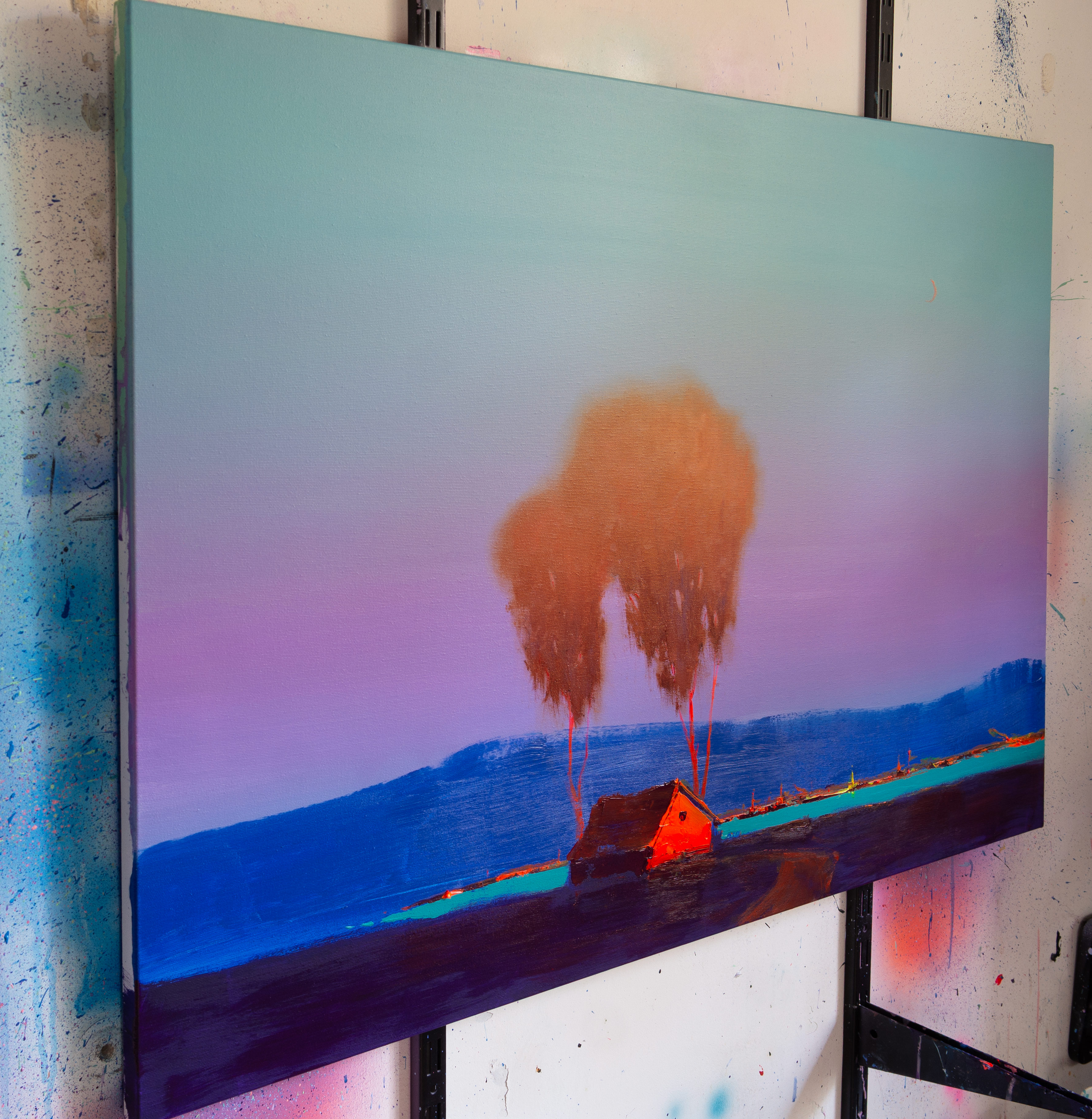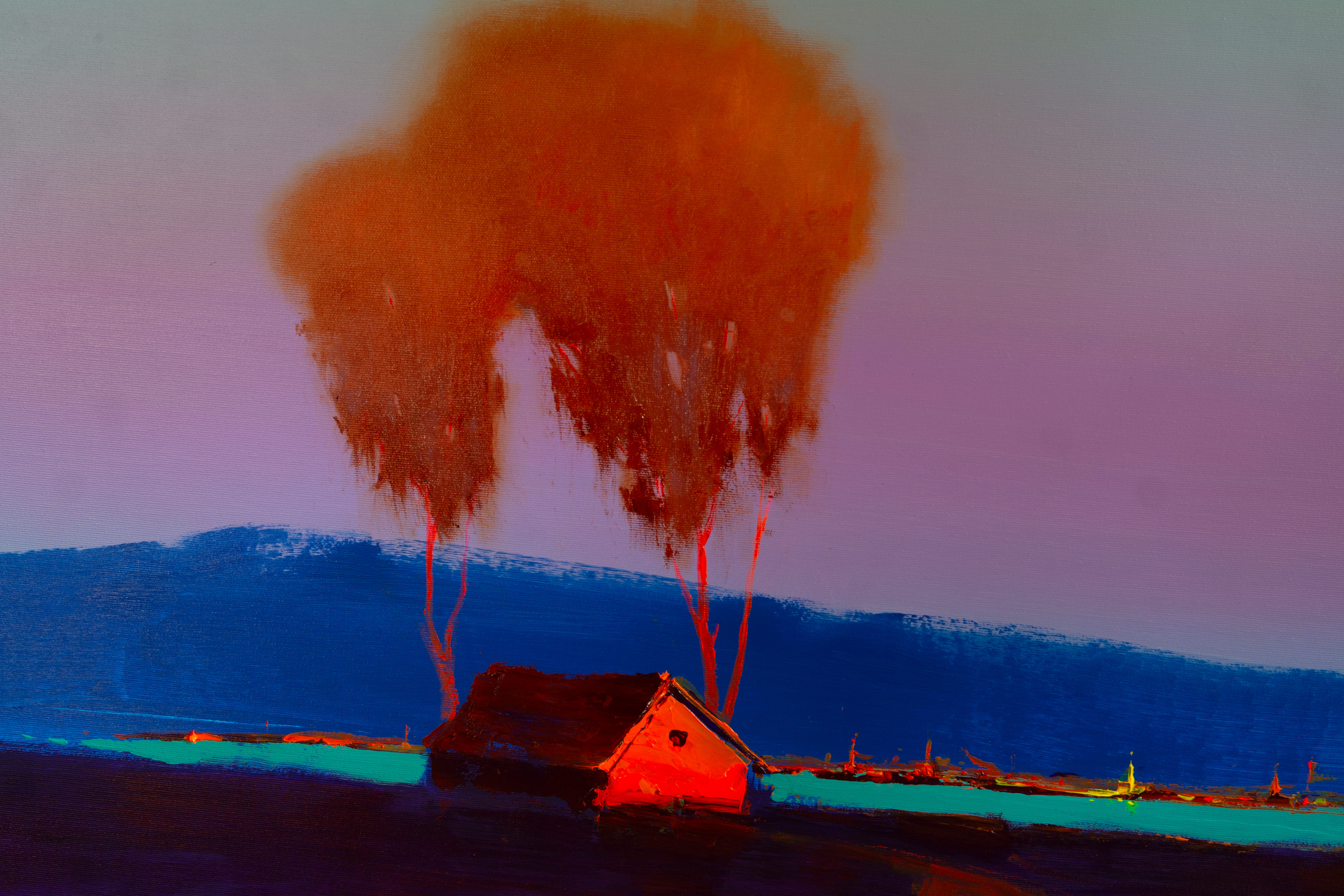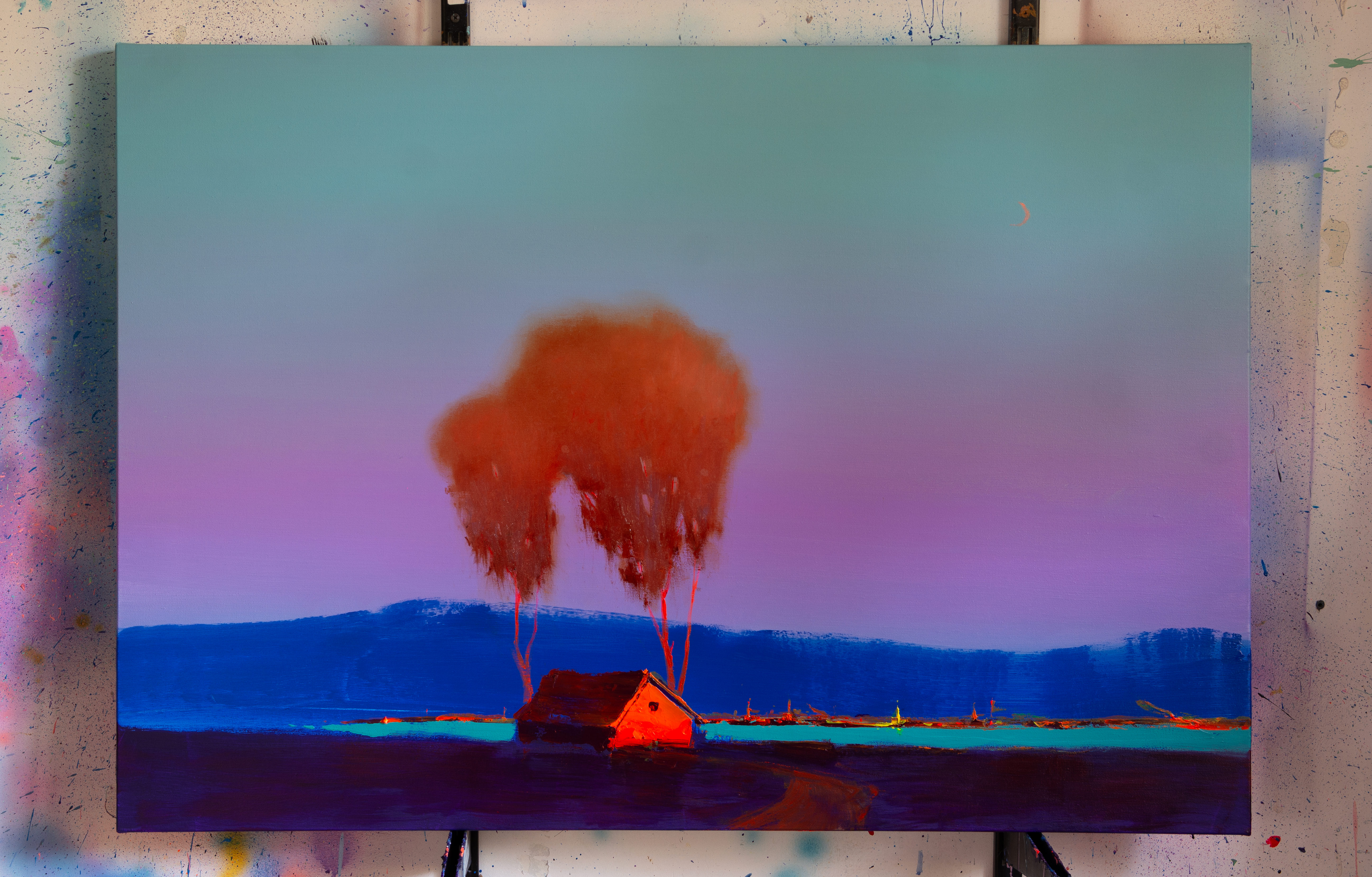 In this painting, I wanted to capture the quiet stillness that settles over a coastal landscape as day fades into night. A small house stands near the sea, glowing with warmth against the deepening blue of the horizon. Behind it, soft red trees rise like a memory of sunlight, while distant mountains dissolve into the mist.